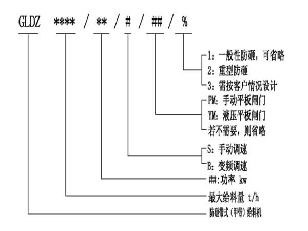 防砸閥門帶式(甲帶)給料機型號說明: